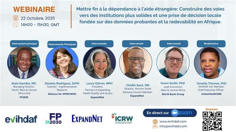 Envie de savoir comment mettre à l’échelle des innovations en santé, sécuriser un financement durable et construire des systèmes locaux responsables? Rejoignez EVIHDAF, FP2030, ExpandNet et ICRW pour un webinaire de 90 minutes sur « Mettre fin à la dépendance à l’aide étrangère : construire des voies vers des institutions plus solides et une prise de décision locale fondée sur les données probantes et la redevabilité en Afrique. »